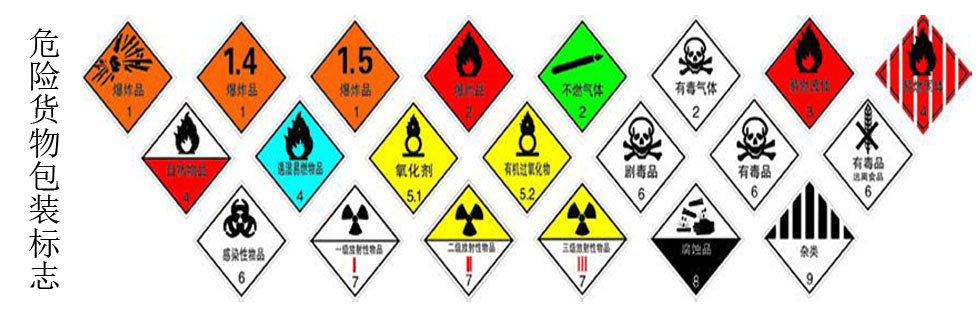 一类:爆炸类的;二类:压缩气体;三类:易燃液体;四类:易燃固体;五类:氧化剂和过氧化物;六类:有毒的;七类:放射性的;八类:腐蚀类;九类:杂项和海洋污染物。